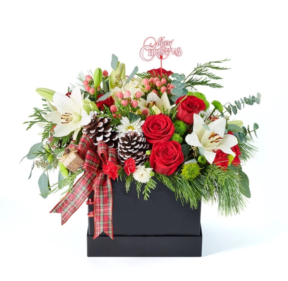 Our Christmas themed Hat Box are each uniquely made with the freshest flowers to suit the season of joy with added baubles & glitter.